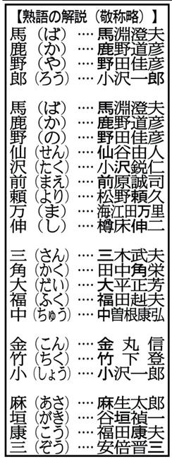 自民党政権下では、前出した「三角大福中」のほか、経世会全盛時の実力者3人を並べた「金竹小」(こんちくしょう)、小泉純一郎首相の後継を狙った「麻垣康三」(あさがきこうぞう)が知られている。