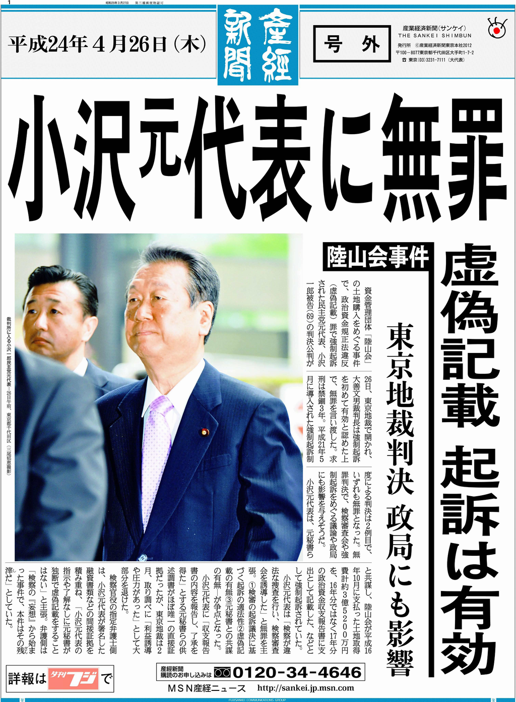 資金管理団体「陸山会」の土地購入をめぐる事件で、政治資金規正法違反(虚偽記載)罪で強制起訴された民主党元代表、小沢一郎被告(69)の判決公判が26日、東京地裁で開かれ、大善文男裁判長は無罪を言い渡した。求刑は禁錮3年。平成21年5月に導入された強制起訴制度による判決は2例目で、いずれも無罪となった。